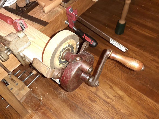 Chez GVI does have a small hand-crank bench grinder, which I bought for (I think) $15.00 at an antique store of the type I've discussed elsewhere. These grinders are small, handy, plentiful and inexpensive. They are an ideal preparedness item.