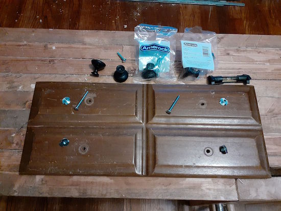 I wanted somewhat heavier drawer pulls than the ones that were originally on the drawer, and in particular I wanted something with a rounded face. The knobs that were on it previously were indeed circular, but they were small and flat on their face. You see, this is what is going to contact the surface the table is placed upon - they will serve as the table's feet. The ones I got came with two different lengths of machine screw, and I'll be using the longer of the two.