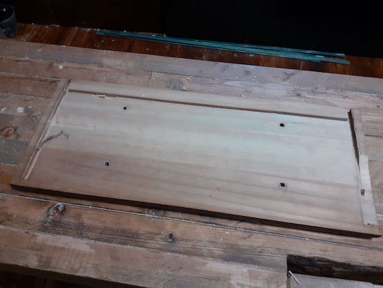 This is the front of a drawer from a dresser I disassembled a few months ago. It already had holes bored in it for the previous drawer-pulls, so it saves me several steps. If you're using store-bought lumber, I recommend spending the extra money to get the kind that's finished-and smooth on four sides, unless you really really like truing up rough-cut boards. You spend money or you spend time - your choice.
