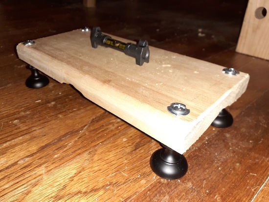 The truth is, either will work just as well for the purpose. But a line level allows far greater precision in adjustment, by way of the method of leveling. In addition, while I could simply glue a fish-eye level somewhere on the table - or even get fancy and inset it into the table - this would not only mean I lost that portion of the table as a working surface in the future, but I would also lose the use of the level for anything other than just this one device, to say nothing of the inaccuracy created by not drilling a perfectly square inlet or the glue-blob throwing the level out-of-true. Declining to permanently inset a level into the board is lazy, but it's an example of "laziness in the right direction."