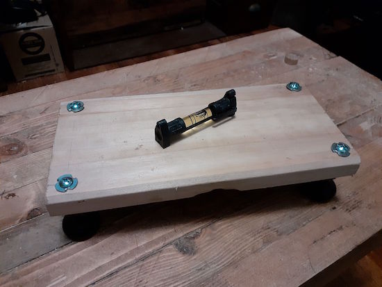 I do my casting on my front porch, but this porch isn't level. This isn't a problem when I'm holding a bullet mould underneath the spout of the furnace; but the present project will be different. I needed a working surface about the size of a small cutting board that can be leveled, so I have somewhere to put the wheel while the babbitt-metal goes in the hole. And while I'm sure I could find such a thing ready-made, I'll be damned if I'm going to buy one when I can just make it for pennies-on-the-dollar, and be sure it's fit-for-purpose.