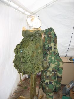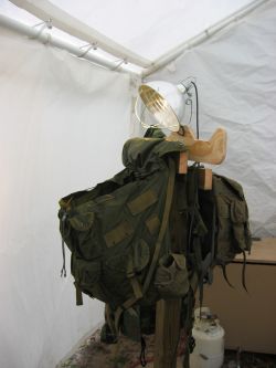 The piece of ¾" plywood at the top was an after thought and it is really what got this project going in the first place. I wanted a place to hang ponchos and rain gear to dry. When I was cutting the rounded edges of the board I glanced over and saw a clamp-on shop light so I cut the place on top so I could have convenient lighting while working with the gear. This pack stand serves as a place to store jackets or rain gear as well as a place to store BOB’s or patrol gear. So far I find it very handy.
