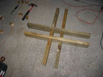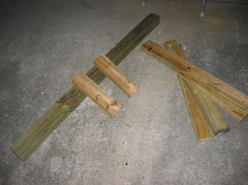 To start with I cut a 4X4 treated post to five feet and some treated 2X4’s to four lengths 32" long. For the cross pieces you will need two at 14".