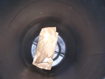 I then placed the lid loosely on, and waited for the dry ice to sublimate. I did this on a summer day, and it still took well over 24 hours for the sublimation to be complete. For the first few hours there was a heavy layer of frost on the bottom that later turned to a small sheet of ice. When the bottom of the barrel was room temperature, I caulked the lid with silicone caulking, and screwed the cap on. It is now waiting to be buried.