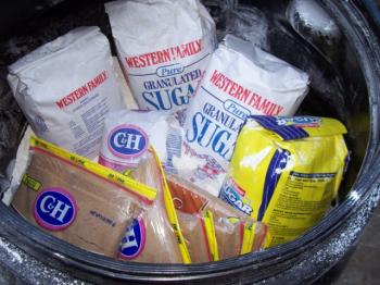 Next I dumped in 250 lbs of Canadian Gold Whole Winter Wheat. The barrel still had room so I added 50 lbs of white sugar, 10 lbs of brown sugar, and topped it off with 30 lbs of oatmeal.