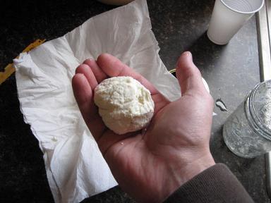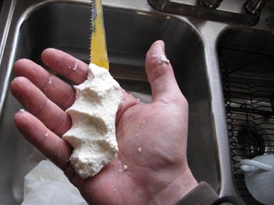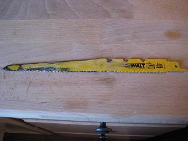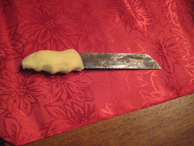 I then gathered all the curds and wrapped them in a paper towel to squeeze out all excess liquid. I then kneaded the ball in my hands. This seemed difficult at first as the ball had a tendency to break apart but after a few minutes it took on a doughy consistency. I wanted to use it to make a handle for a tool and I had thoughts of removing the handle from one of our steak knives but I foresaw how well that would go over with my wife. I headed for the basement and grabbed an old dewalt sawzall blade. I notched the top with a grinder so the blade didn't slide out of the handle.