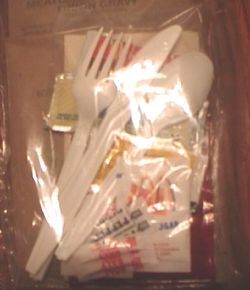 First, I took a few packs of top romin and mixed in a 1/4 cup of the dehydrated veggies. Then, I vacuumed sealed the lower portion of the bag. In the top part I put some plastic forks and condiments (thanks to fast food restaurants), as well as a beverage. Just add water and you're ready to go.