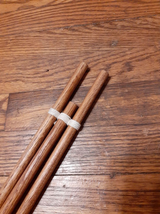 I stained the sticks with "teak" colored stain because why-the-hell-not, and rubbed some beeswax on the "outer" sticks where the tripod hitch goes. The center one has no beeswax because it must slide up-and-down easily. Common twine is used in all cases because the center stick will slide well on it but still hold tight, and you can get the stuff anywhere. You could whittle the tips to a point or add metal spikes of some sort on the end, but I chose to Plasti-Dip mine because I may want to set them up on a paved surface; and as any surveyor will tell you, pointed tripod legs DON'T play well with concrete.