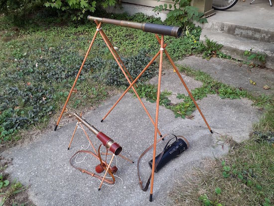 The single tripods were conventional affairs whose mount clamped the telescope at its "balance point" with a wingnut. A clever machinist could probably make a mount like this one, adapted to a good camera tripod, with relative ease, but I'm neither clever nor a machinist. The number of ways a store-bought camera tripod could be pressed into service is limited only by one's own ingenuity and industriousness.