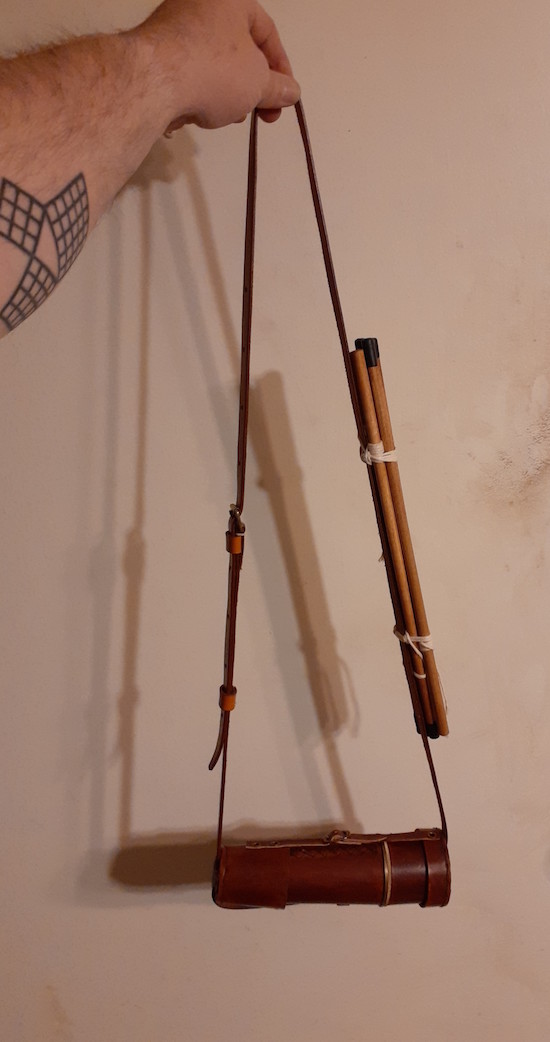 My "Scout Regiment" telescope, re-stained, new strap, cannibalized original strap holding the end caps, with short legs stowed.