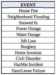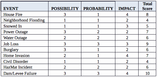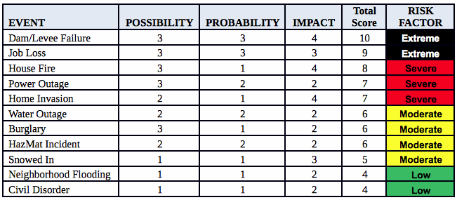 By adding up the score for each event you come up with a score from 3 to 10. Here's a sample of how what your chart will look so far. Don't worry if your numbers don't match these, they're just examples and yours should match your situation - for example a dam/levee failure could be a life altering event for somebody who lives in a low lying area a few miles downstream from the dam but only be an inconvenience for somebody also nearby but outside the flood zone.