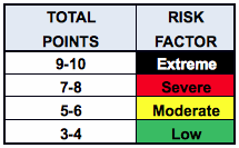 The total score for each event is your Risk Factor. Exactly what does that mean? Basically you've just ranked out the seriousness of the events you could possibly face - the higher the score the higher the priority of preparing against that event. Although you can categorize your scores anyway that makes sense to you, this is one easy way to do it: