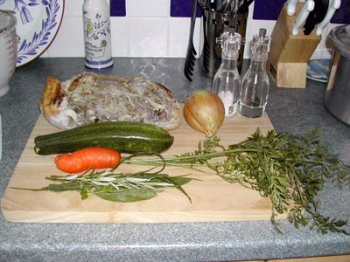 For this stock I am going to use a Duck carcass, Onion, Zucchini, Carrot and a mixture of fresh herbs. A little salt and pepper is added for seasoning. Golden rule wash hands before handling food