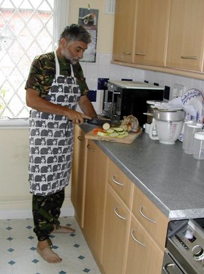 You don’t have to be too fussy just roughly cut the vegetables, you don’t have to wear an apron, but I like to keep my BDUs clean.