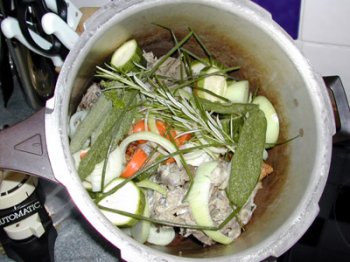 Put all the ingredients in the cooker and add water to about ¾ full see your pressure cookers instructions on this. Bring the cooker up to high pressure, set a timer, in this case 30 minutes and go and do something useful.