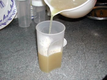 Put the strainer on top of the jug and then pour or ladle out the stock