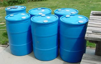 I know it’s a real old horse that’s been beaten just about to death but for the record, as a minimum you need about 2.5 gallons of water per person a day to live in a minimal level of comfort. What you are looking at are 30 gallon food grade polypropylene barrels. They hold about 35+/- gallons each and are about as big a container as one person can handle by themselves. Some one told me they were about 250 pounds apiece when they were filled and if you use the old kids rhyme of "a pint a pound the world around", that sounds about right. I figure on using 2 barrels per person for one month’s usage. The 30-gallon size is large enough to allow the minimum amount of containers you might have to move but small enough that contamination of one barrel won’t really be a fatal error. A 55-gallon barrel is more than I can handle and runs about 500 pounds when full. Today it was beautiful outside and we decided to pour the water on the lawn and help it out also. Here in the desert 180+ gallons of water is a bunch but the lawn easily took it up. (I guess it was kinda dry)