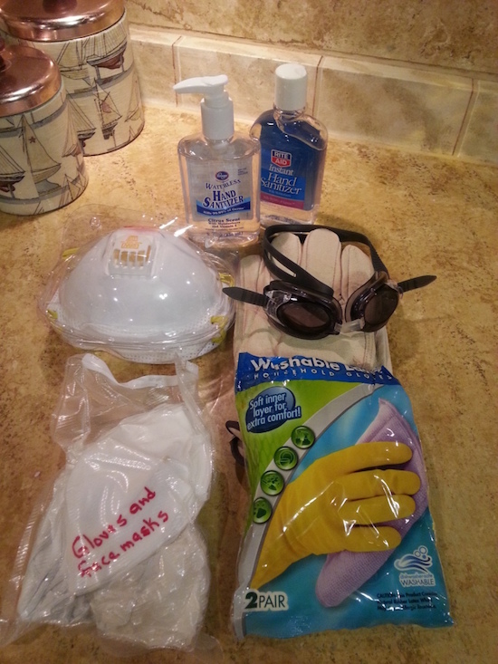 Protect yourself first - specially if you're cleaning after a disaster. I include: (4) N95 masks with respirators. The respirator types cost a little more but they are so much better. Heavy-duty, long-cuff rubber cleaning gloves - not the little medical gloves that come to your wrist. Plus, leather work gloves and hand sanitizer. I prefer swim goggles over regular safety glasses, specially if bio-hazards are of concern because they seal to your face.