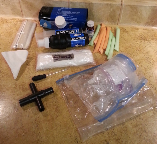 These items disinfect and filter water: A camping pot and lid to boil water, BIC lighters, fire starter, matches and a foldable Esbit stove. Coffee filters to pre-filter water, an eye dropper, purification tablets as well as a commercial silcock wrench, a bunch of quart-size ziplock bags, and instructions for purification. The colored straws contain rehydration salts- just in case someone over does it in summer heat and humidity.