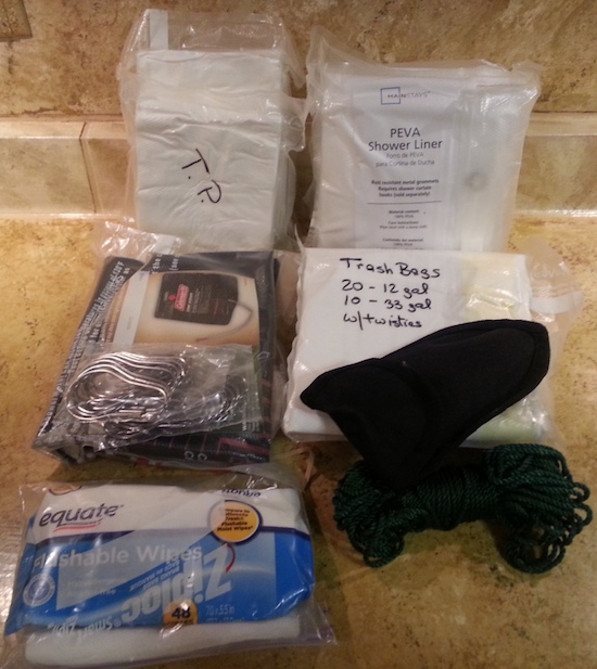 The buckets can be a potty. Perhaps a his and hers if that makes since, or a pee and poo if that makes since - but as usual, with two comes options. Trash bags: 30 12-gal, and 10 33-gal drum liners. 4 rolls of toilet paper, baby wipes, and SuperSorb. SuperSorb looks like sawdust. Sprinkle a little into the trash bag and everything is absorbed and turned into a gel. No toxins, no smell. An emergency toilet seat doesn't store in the bucket, but is nearby. A lot of stuff in this category is vacuum sealed to reduce volume. Remove the cardboard from the center of the TP to save space. Two cheap nylon shower curtain liner with hooks provide enough room for a privacy enclosure.