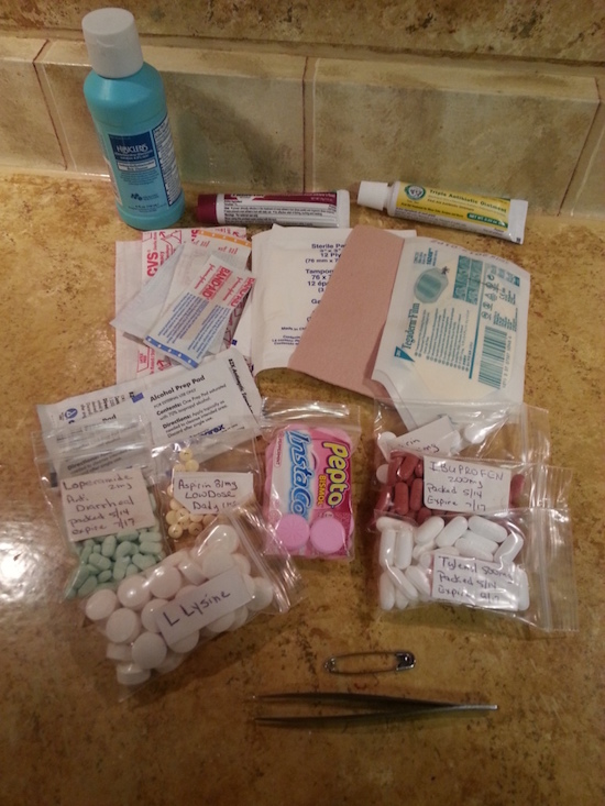 If the disaster is on, I want to have a small med kit handy - anti-diarrheal meds, Advil, aspirin, tweezers, safety pins, triple antibacterial ointment, assorted band aids, tegaderm, a few 3"x3" sterile bandages, and Hibiclens soap. It's because of this component that I inventory the bucket once each year and check on expiration dates.