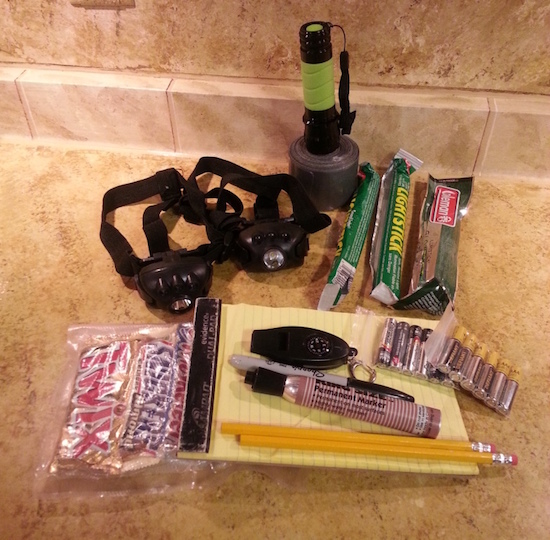 There was space remaining in the bucket so I threw in a few basics: a small LED flashlight, headlamps, spare batteries, duct tape, chem lights, a combination themometer/whistle/magnifier, a pad of paper/pencils/market/sharpie and of course, my favorite - chocolate!