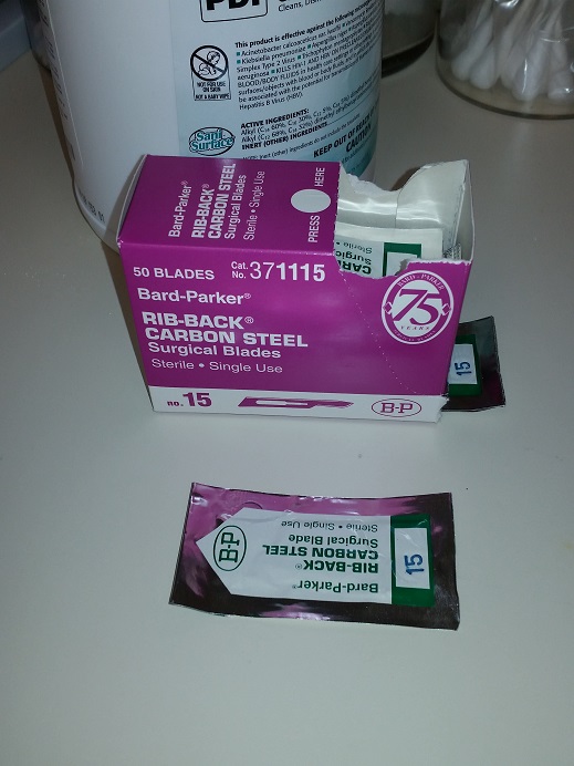 You're unlikely to have an actual scalpel handle in a minimalist kit, but it turns out you can make a pretty functional handle from the foil they're packaged in. Just PEEL the foil open just enough to remove the blade (this is how most are designed to open anyway).