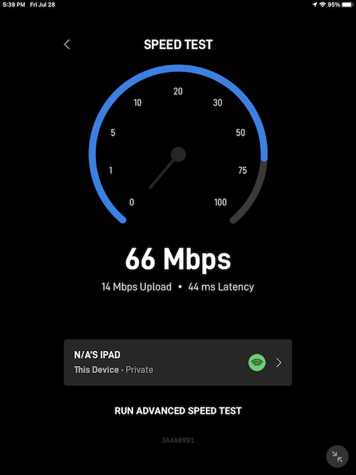 Here are three screenshots of the Starlink app running on an old iPad. The first is from last Friday evening about 5:40 PM (peak time period), the second is from tonight (Sunday) about 10:30 PM and the third was from a Saturday afternoon around 2 PM a month and a half ago. I can live with these numbers.