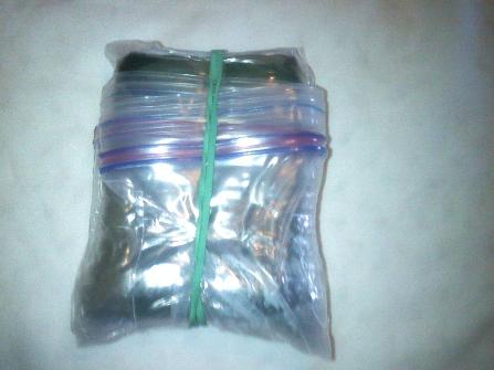 Under the rubberband and first Ziplock is another 1 qt Ziplock and you can finally see the tin. This was a tin for a Dollar Store kind of mint, but the same dimensions as an Altoids tin.