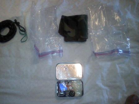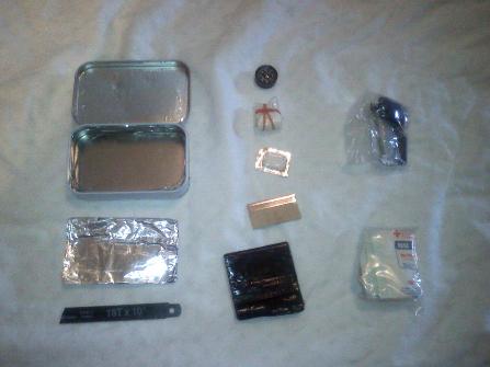 Starting left to right, top to bottom: 1. Tin with reflective tape under the lid and 2 feet of wire wrapped up inside 2. A piece of aluminum foil, big enough to fashion a cup for boiling water 3. A piece of hacksaw blade 4. Compass 5. Small package of cotton balls with vaseline 6. A piece of gum 7. Razor blade 8. 2 feet of duct tape 9. Fishing/Sewing/Firestarter pack 10. Medical kit