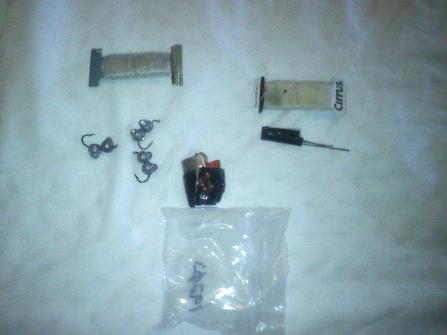 The Fishing/Sewing/Firestarter pack has a bit of fishing line, 3 hooks, 6 sinkers, bit of dental floss, 3 sewing needles and the top of a Bic lighter.