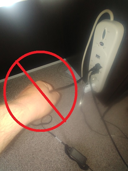 Last night my wife woke me up at 3 am to tell me there was a spark, then the lights went out when she was unplugging her laptop. After a few drowsy moments I finally understood what she was trying to tell me. I figured the breaker popped so I turned on the flashlight on my cell phone and unplugged the laptop and inspected the cord. The plug was about to fall off the cord and I could see the copper wires at the backside of the plug end. I told her I would fix the cord in the morning then went and flipped the breaker back on and went back to bed.