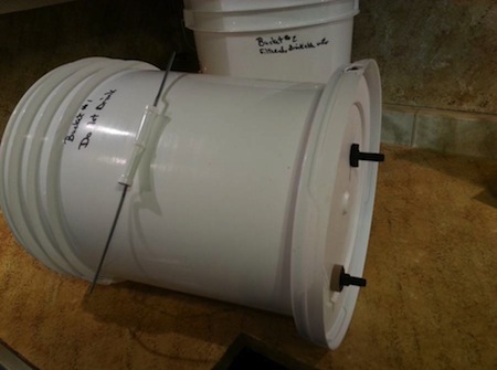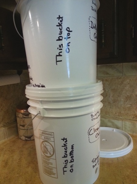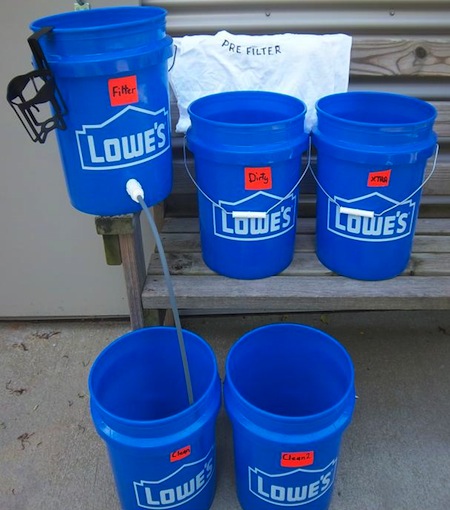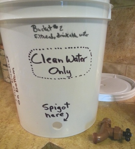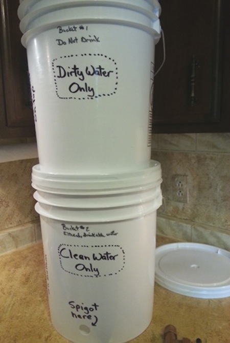 Prepare buckets in advance. You'll need to drill holes and insert fittings. You could also drill a hole for a water spigot into the clean water bucket to make it easier and more sanitary to dispense potable water. In other words, get it all set up before you need it.