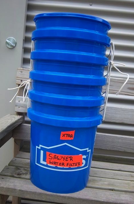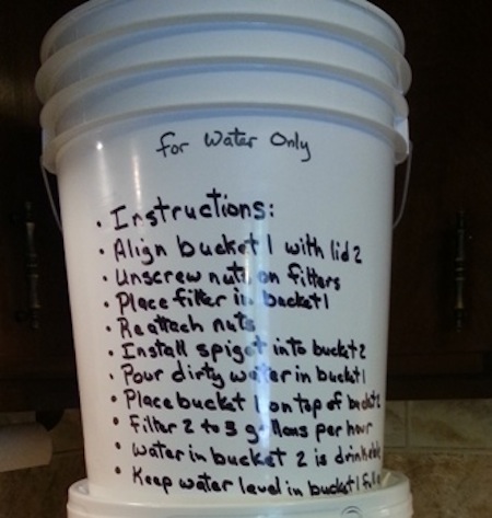 Have a few. You need at least two to transport, store or pre-filter "dirty water". You need one as a container for the water being filtered plus you need at least one to transport or store "clean water". Plus, I like to have an extra, so that's a total of five buckets. Label each bucket so the clean water bucket doesn't become contaminated with dirty water. I also label "For Water Only" to make sure that water buckets don't get used for Hubby's oily garage projects. I write instructions right on the bucket so I don't forget my methods.