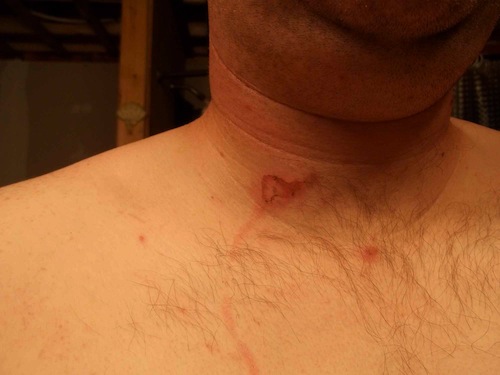 Always "dress down" so that stuff will hopefully roll off or at least shake out in a hurry. You don't want hot metal getting trapped in your clothes. I think a Nomex hood will resolve that hickey problem from happening again.