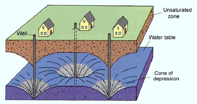 If you carefully measured the lake level, you would find that its level has dropped due to the drought. Your neighbors' pumping could have also dropped the lake level AND/OR your local water table (affecting your cone of depression also – see second figure below). If you guys pump enough, the entire lake could go dry (third figure below).