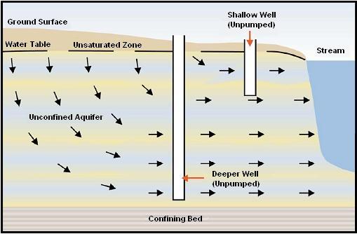 Let's get back to your situation and consider what happens when your first neighbor moves in, constructs a deeper well than yours, and pumps out more water than you – it will create a bigger and deeper cone of depression than for your well. The smaller the soil porosity and permeability values, the larger the resulting cone of depression. The new well could actually reverse the water flow direction at your well (see figure).