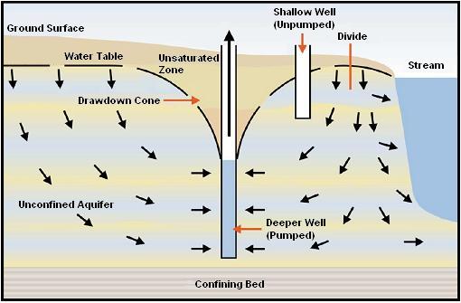Please note there is a time delay as groundwater moves through tortuous paths of porous soil. If a neighbor starts pumping more water (on average), his cone of depression expands wider and deeper (slowly) until the total water flowing into the well equals the total water pumped out. A larger cone of depression captures a larger volume of flowing groundwater to send to the well.