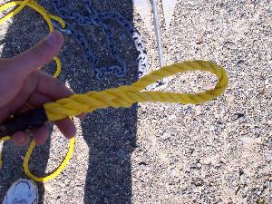 I made my line using 3-stranded polypropylene. I spliced an eye into the end that attaches to the boat. I can also attach another line if I need to length it. There is a splicing article in the Rubicon on how to splice 3 strand.