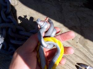 In the lower end of the rope, I spliced another eye with a thimble in it. (That’s the metal thing you see where the chain joins the rope). This will prevent the rope from the abrasion of the shackle.