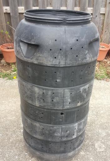 I selected a recycled 55-gallon olive drum. I like this one because it is black and because of its large lid. A black composter keeps the composting bacteria warm, which helps to generate heat, killing unwanted (weed) seeds. The large lid means grass clippings go in and retrieving the processed compost is easy. My drum is 45" tall.