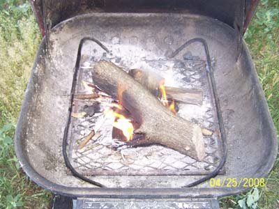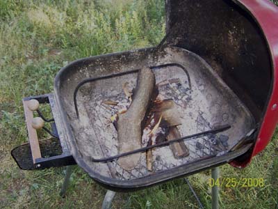 I focused the small point of light on the kindling ball I made and within 20 seconds I had embers glowing. I folded that over and with a couple of breaths I had a nice flame going. I placed it in the bottom of the grill and started piling my small sticks that I GATHERED BEFOREHAND... YOU DO GATHER YOUR SUPPLIES FIRST DON'T YOU?