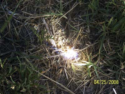 The only thing you need to make fire is an unobstructed view of the sun and a fair amount of kindling. Remember to hold your lens so that the ribbed side is facing the sun. I grabbed the camera after I started so there is not pics of the kindling but it was just folded over broomweed and dried grass. I made a ball of kindling the size of a softball and used the lens to create a hot spot and poof. I made fire.