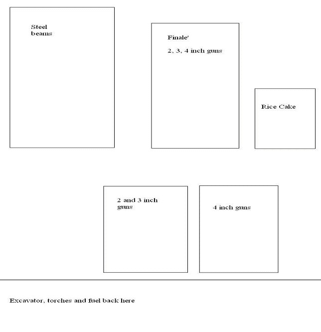 It was basically like this. The rice cake was near the corner and the finale’ was about 6’ away. To the left of the finale’ were a bunch of steel beams. About mid deck is where the main show was located. We were shooting 2, 3 and 4 inch shells.