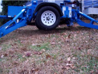 The machine runs on 4 Trojan T-105 batteries and can be charged with 110VAC. Maximum height is 34 feet and maximum platform load is 500 lbs. It has to be level to operate and has sensors that'll prohibit it from lifting if it becomes unleveled and yep, they are pretty sensitive. The only option is down. Notice above the tire is off the ground. The outriggers will hold the weight of the machine and are controlled independently