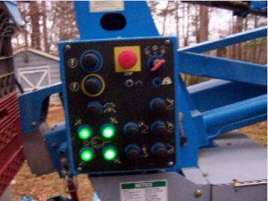 There are two bubble levels located near the ground controls. Utilize these and use the outriggers to level the machine. The red STOP button must be pulled out both on the ground and platform controls. Use the key switch and select ground controls. The green-lighted buttons control the outriggers. On this particular machine, notice the button with the blue circle around it and the button with the yellow circle around it. If you hold the blue one down and then push an outrigger button the outriggers will come up. If you hold the yellow one down and push the outriggers button they will go down.