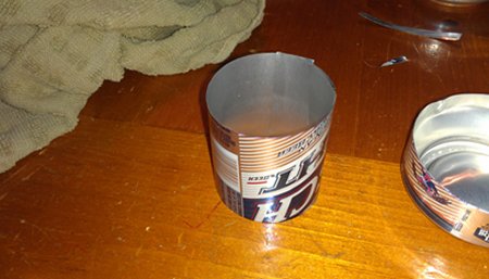 First, starting with an empty and clean can, cut out the top of the can along the rim. A P-38 can opener, properly sharpened, makes this easy.