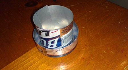 Using scissors or scoring the can as above, cut off the top part of the can at about 3/4". Save the center section of the can to make the center support/inner wall. Place the top portion open side down and the bottom portion over it. Press lightly and the lower portion will slip tightly over the top. It may wrinkle slightly, but this can usually be smoothed out and does not materially weaken the stove.