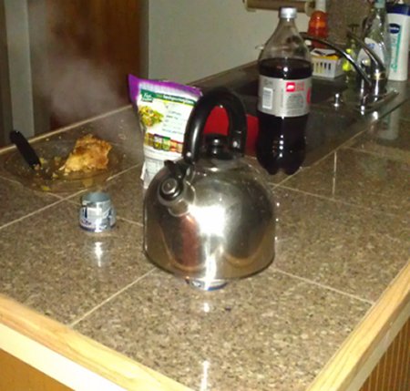 Using a quarter inch (about 30mL) of SLX denatured alcohol, I test ran this stove using a heavy bottomed kettle and 2 cups of cold tap water. In the field, a smaller and lighter vessel and a windscreen would be advisable. From room temperature to a full, rolling boil with the whistle screaming was just under five minutes. There was still fuel remaining. Take care to balance the pot evenly. Some test run pictures: