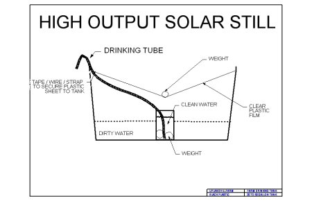 There are several sizes of heavy black plastic water tanks that will make an excellent solar still. We have two 30 gallon plastic tanks on our farm that can be quickly converted into solar stills. To improve the efficiency of the unit, we place it on the blacktop driveway for added heat.
